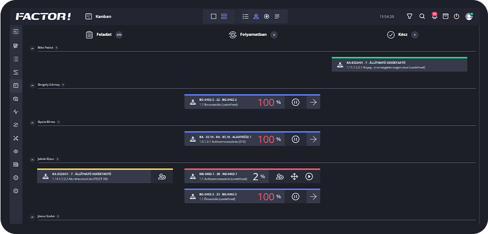 A dolgozók számára kiadott feladatok, gyártási műveletek egy egyszerű kanban táblán jelennek meg, ahol a várakozó, folyamatban lévő és készre jelentett feladatokat át lehet tekinteni.